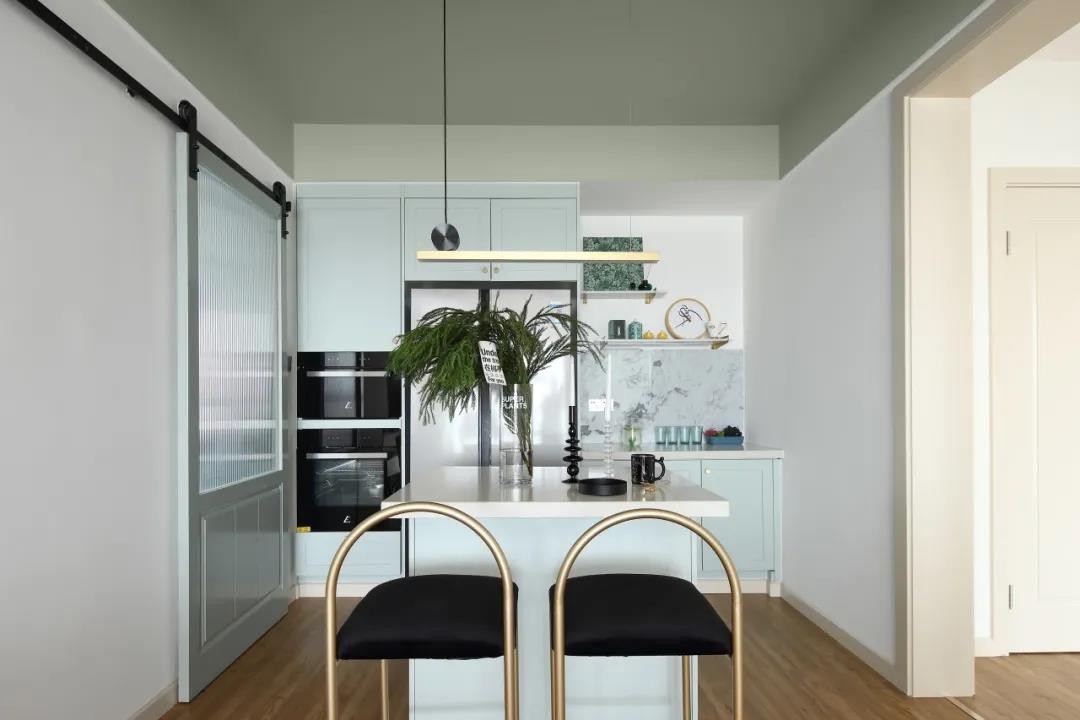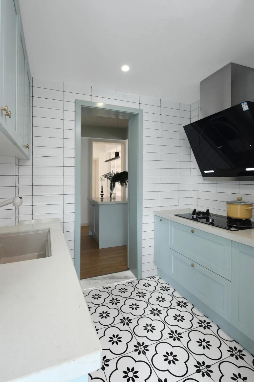 廚房在梅花磚地面+小白磚墻面的空間硬裝,定制淡藍色櫥柜,白色的臺面,讓做飯的氛圍顯得小資而又文藝舒適。