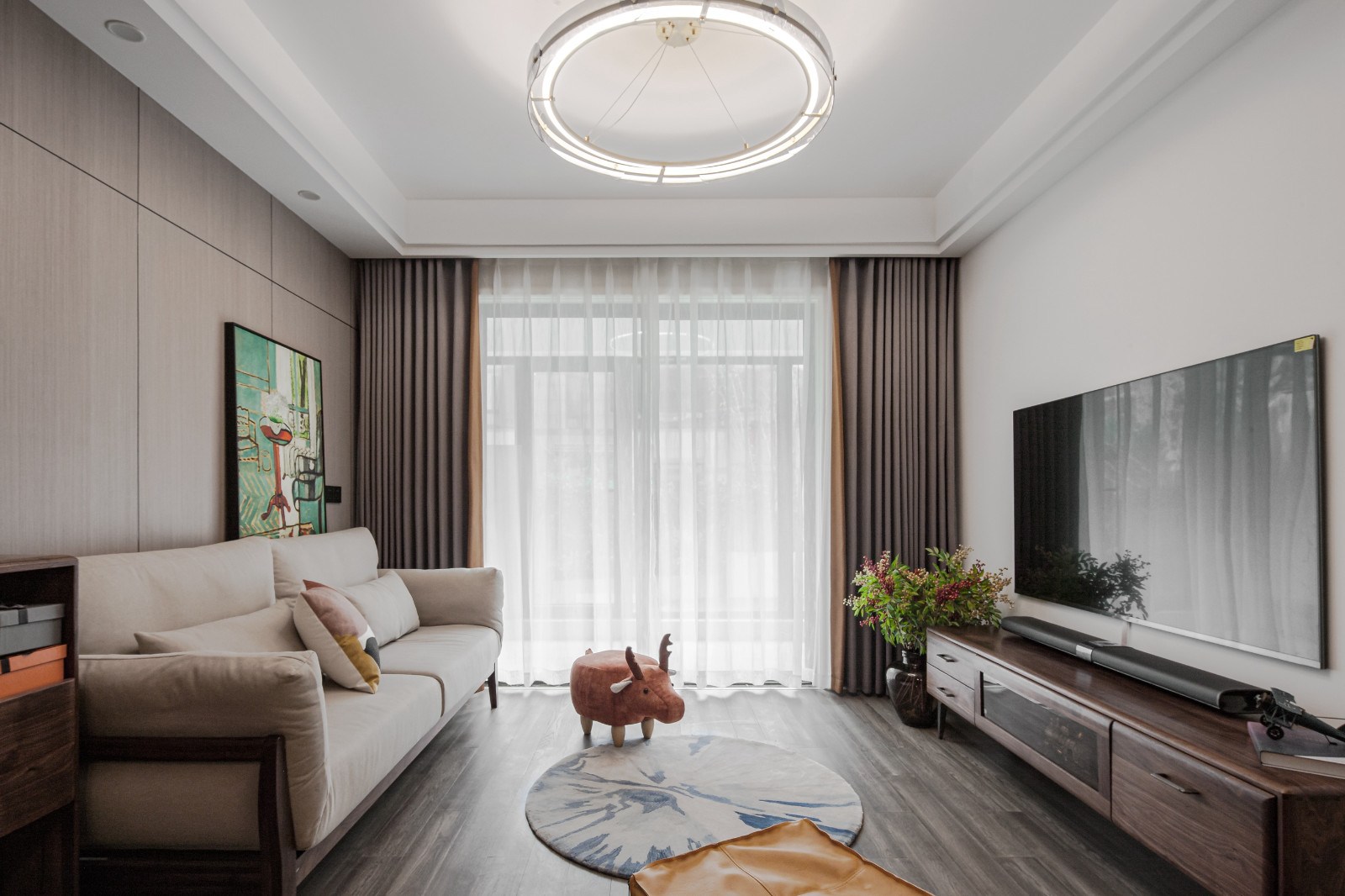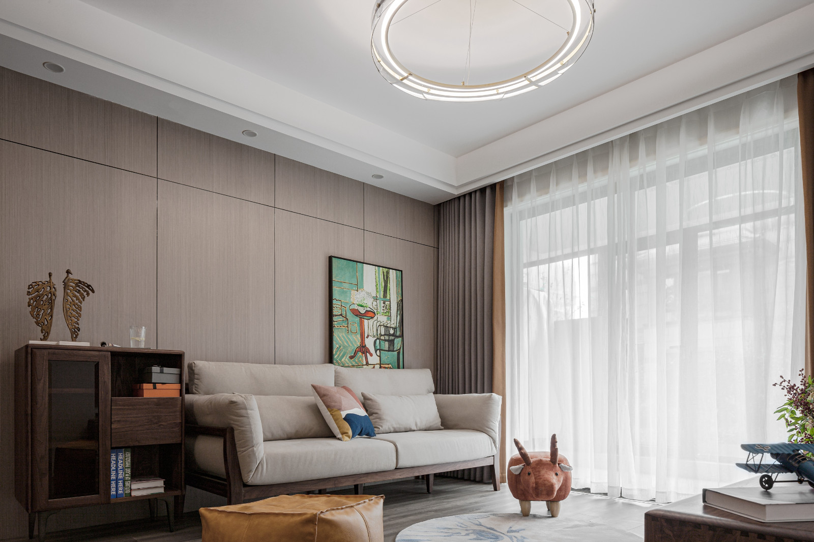 客廳戶(hù)型方正,整面木飾面板裝飾沙發(fā)背景墻,原木家具搭配米色布藝沙發(fā),文藝淡雅。