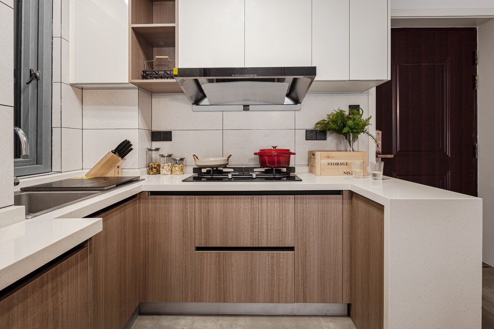 L型開(kāi)放式廚房設(shè)計(jì),充分利用轉(zhuǎn)角空間,合理布局。白色吊柜柜門(mén)+墻磚,搭配木紋櫥柜,色彩清爽簡(jiǎn)約。