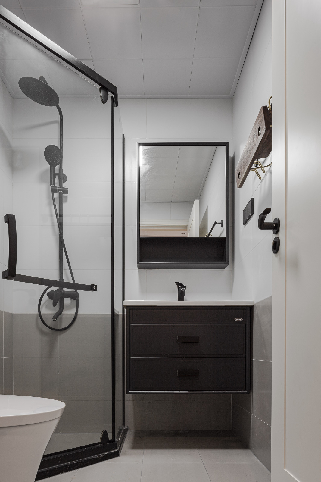 衛(wèi)生間簡(jiǎn)約黑白灰掉,白色+灰色墻面腰線設(shè)計(jì),深色簡(jiǎn)約臺(tái)盆柜加深了空間層次感。