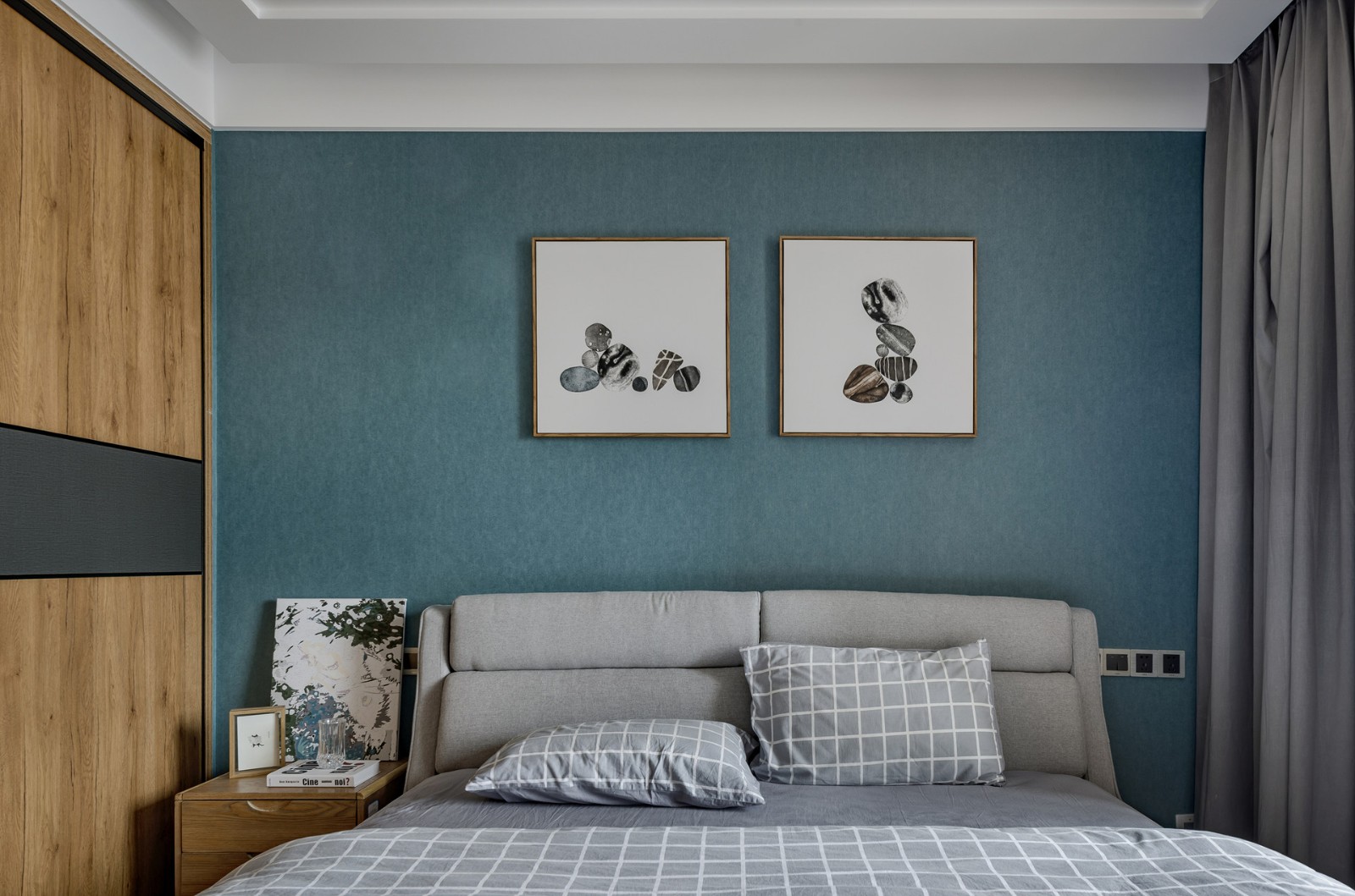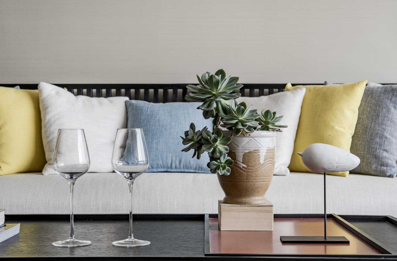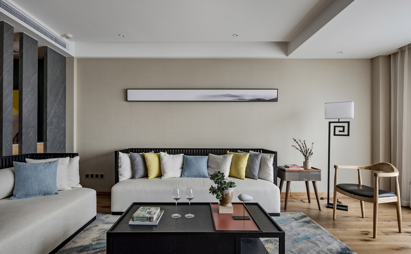 沙發(fā)背景墻珍珠白乳膠漆,新中式特有的落地?zé)簦?jiǎn)單的一副山水掛畫就能體現(xiàn)業(yè)主的品味。
